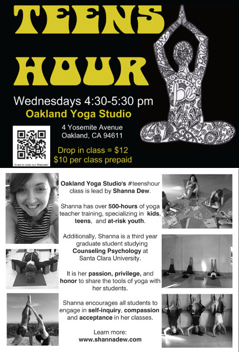 I am currently teaching a Teen's Yoga Class at Oakland Yoga Studio, as well as taking private clients. If you are interested in private yoga lessons please email me: shannadew@gmail.com Shanna was introduced to yoga in 2006 as a freshman in college, practicing in a dimly lit old gym on the farthest end of campus. This simple introduction sparked her interest and devotion to learn more about the mind-body connection. Shanna’s yoga practice soon became a thread of consistency in her life, and foundation of emotional regulation, which sustained her attentiveness throughout her undergraduate degrees, and afterwards, when she taught internationally. She is now a graduate student at Santa Clara University, where she is working towards her counseling psychology licenses. Shanna earned her 200-hour yoga teacher certification from Lila Yoga, in Spokane,Washington, her hometown, where she practiced and studied under the guidance of Lee Bear Tobin. She is currently enrolled in Piedmont Yoga Studio’s 300-hour Advanced Teacher Training program. Her other yoga trainings include: Street Yoga Teacher Training, a Portland, Oregon based non-profit which focuses on making yoga accessible to at-risk youth, Yoga for Kids Teacher Training with Tiffany Belzer at Yoga Garden, San Francisco, and a Yoga For Teens Teacher Training, with Erin Lila Wilson at Yoga Garden. While Shanna has taught a range of age levels from kindergarten to college, she is most drawn to working with teens, as she believes that her teenage years were the most emotionally vulnerable for herself. It is her hope to be of benefit to her students by creating a space which allow teens to explore their own mind-body connection, free of societal pressures, a space to let go of past and future worries, and find one's own unique sense of acceptance and peace on their mats. |